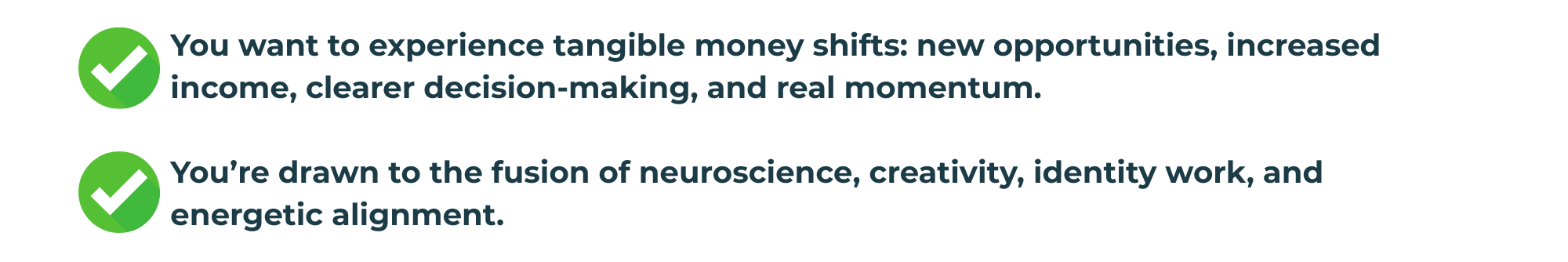 4-week neuroscience-based rewiring + neuro-transformation live group experience, featuring brand-new energy, brand-new modules, and algorithms I’ve never offered before. These tools are designed to dissolve limitations, reprogram your internal money blueprint, and expand your capacity to receive with ease.