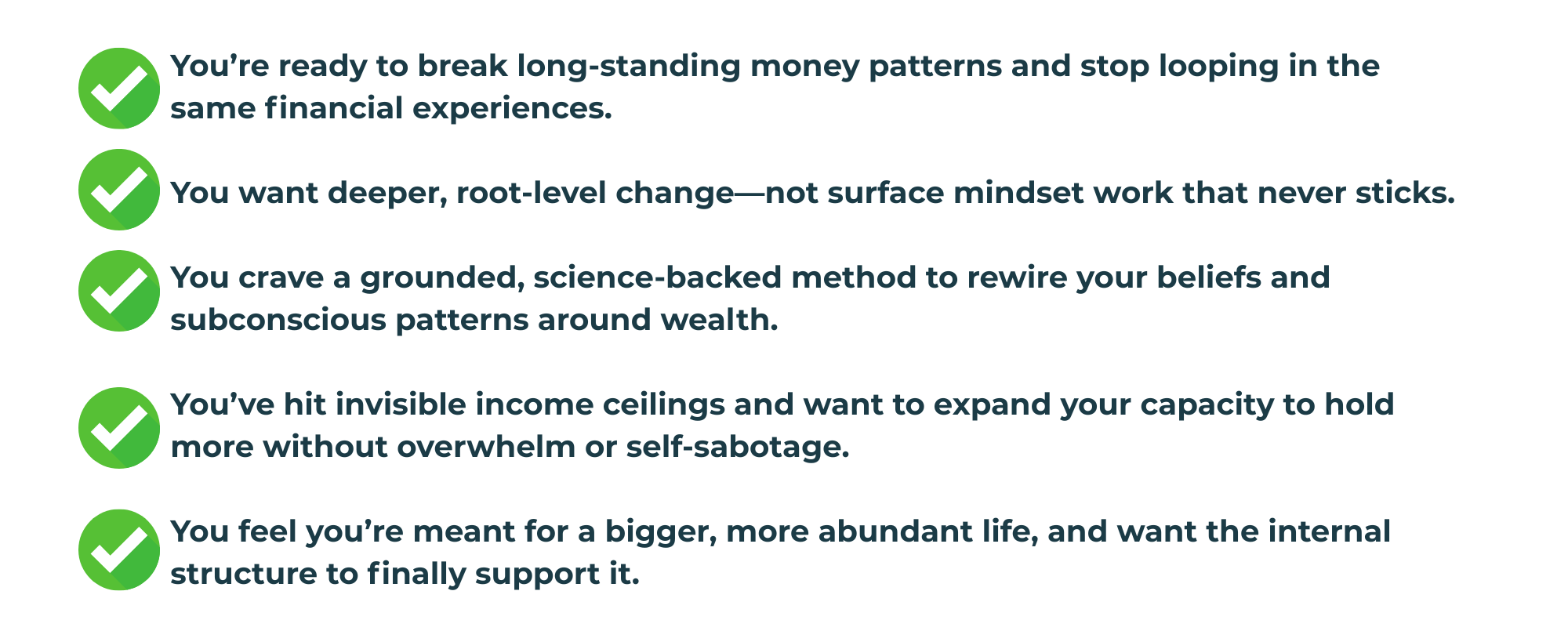 Cleared the fears, inherited limitations, and old identity structures that capped your earning potential and your ability to hold more.